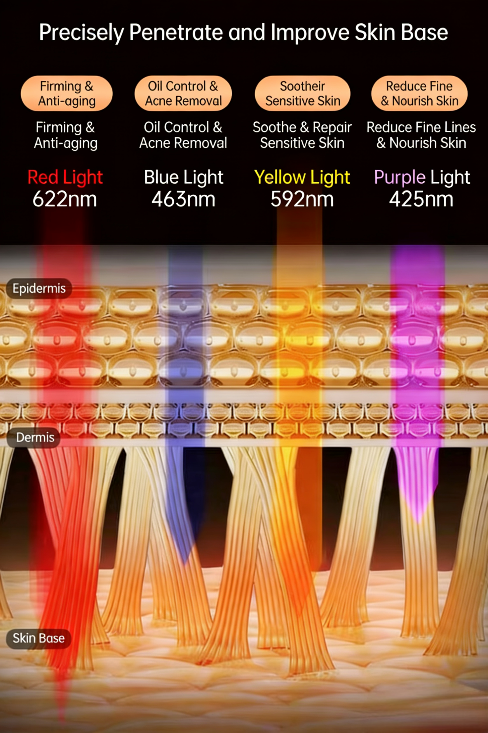 (M3 Yellow Light):Brightens skin tone, improves dullness, and evens out skin color.