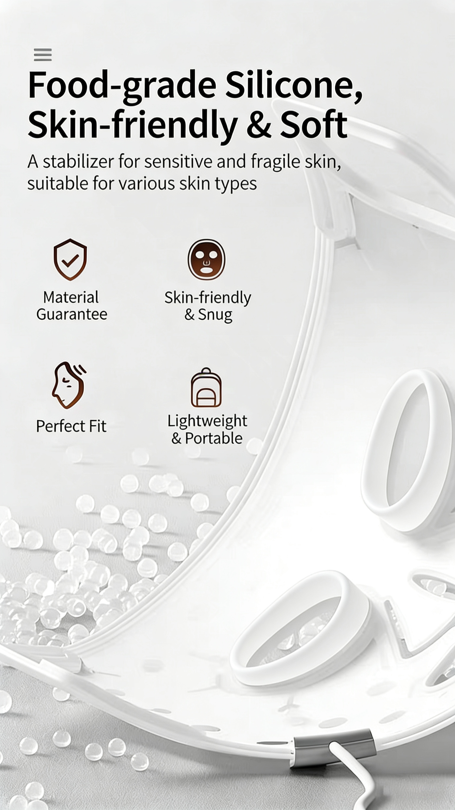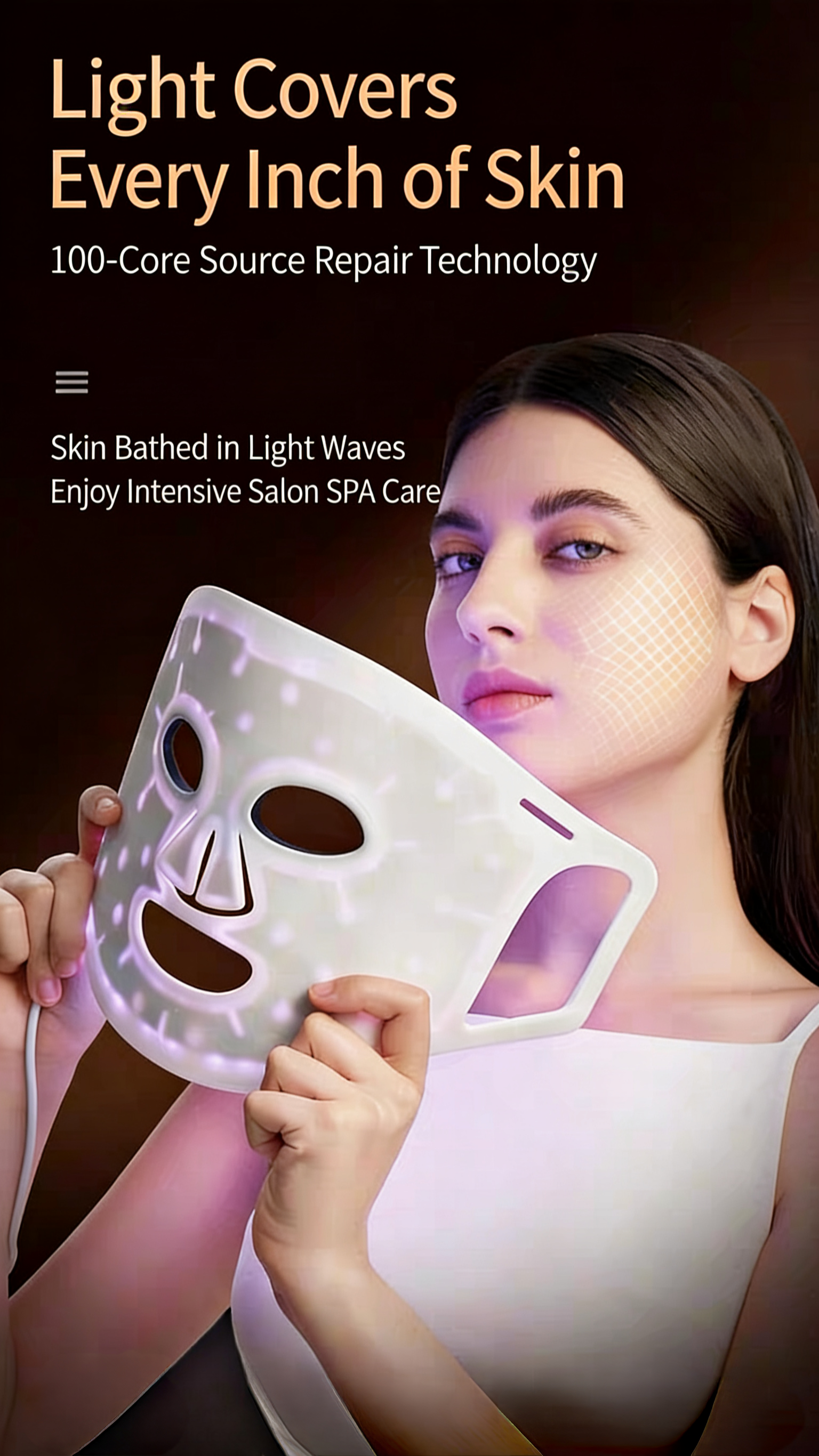 1:Wear the mask on your face, adjust the headband to a comfortable position, ensure the light source evenly covers the cheeks, forehead, and chin. Once worn stably, you can free your hands without holding it.