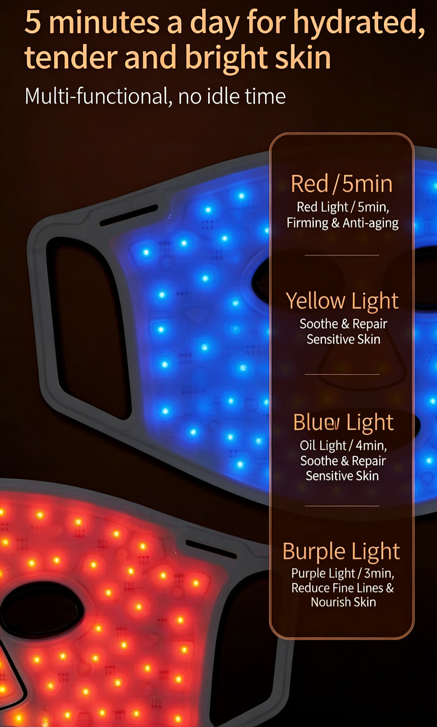 (Mode A):Mode A: Comprehensive mode, integrating the effects of red, blue, yellow, and purple light sources to fully care for the skin.