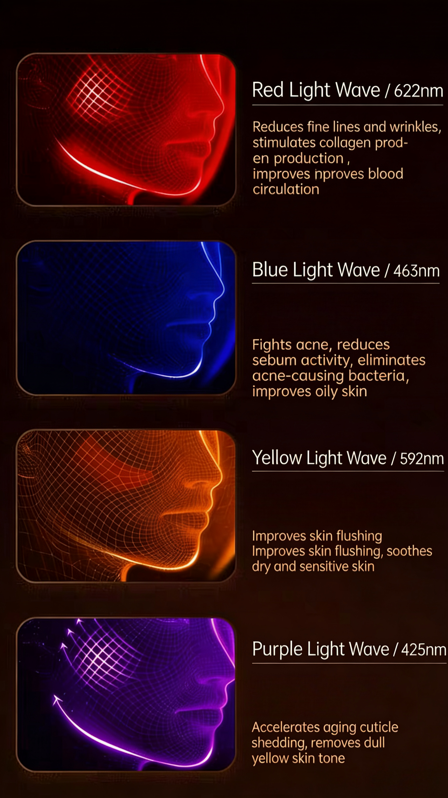 (M4 Purple Light):Soothes the skin, enhances skin vitality, and improves skin texture.