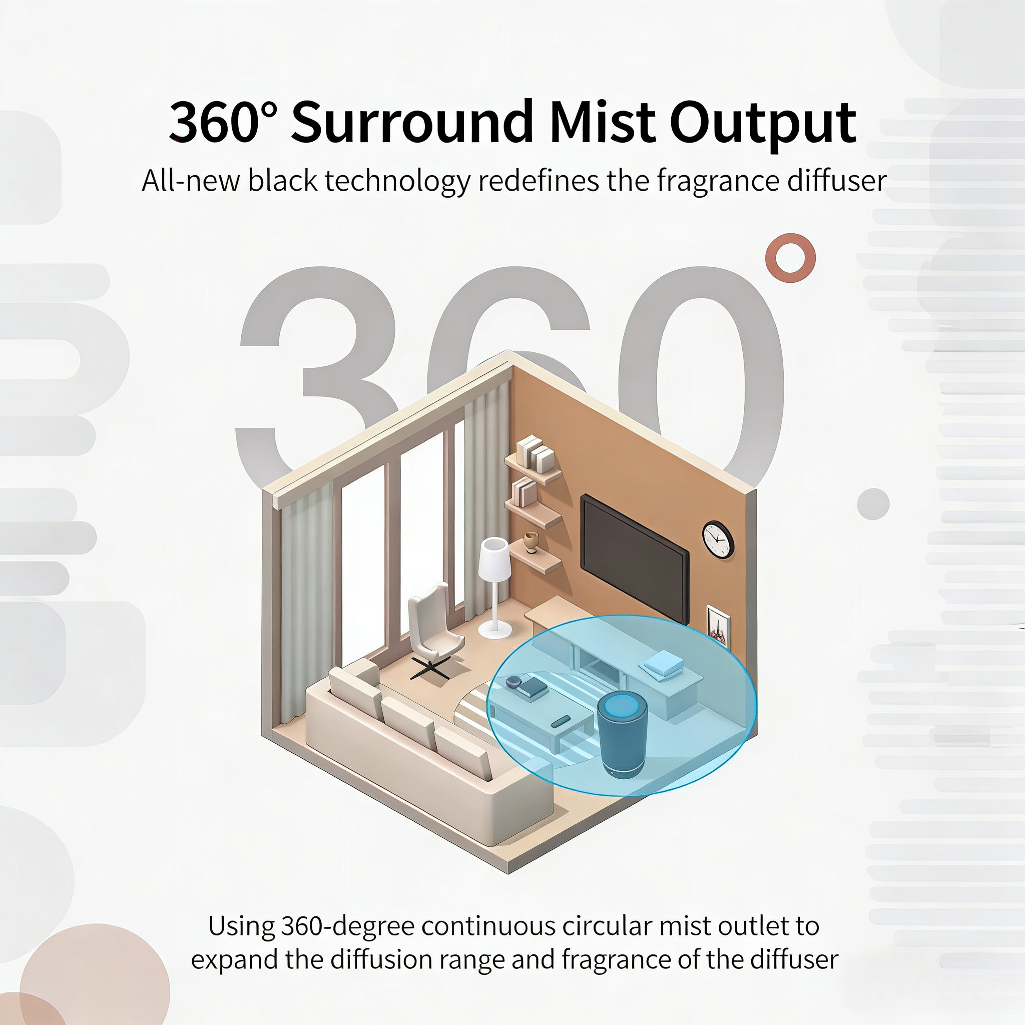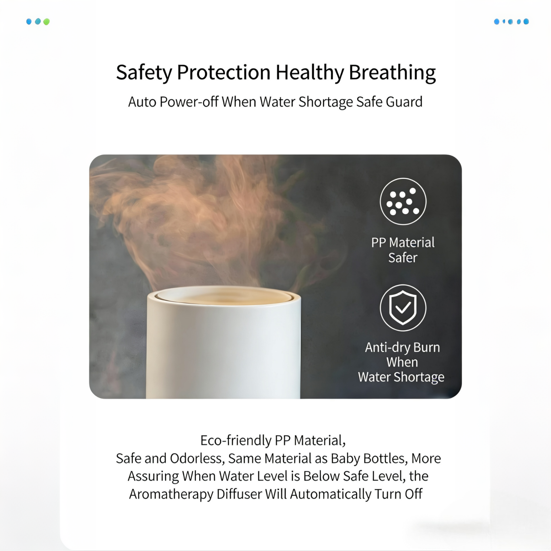 This quiet ultrasonic essential oil diffuser features 360° all-around mist, a BPA-free PP tank, and a soft night light—everything you need for a cozy, safe space. Non-toxic and pet-friendly, it’s perfect for bedrooms, nurseries, and small home offices. Whisper-quiet operation ensures no distractions, while the durable PP material meets North American safety standards. A top-searched aromatherapy diffuser with 360° mist to turn your space into a fragrant, peaceful oasis.